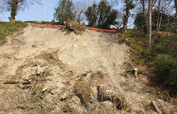 Around a metre of the width of the carriageway was lost in the landslip – reducing it to three metres. Although the depth of the landslide was relatively shallow, the damage was extensive and trees and shrubs below were displaced due to the sheer mass of soil that moved.