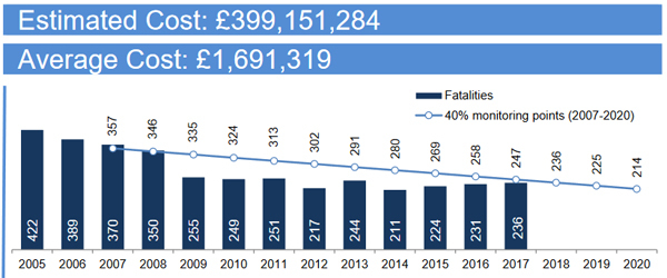 Last year's document, which covered 2017, included a bar chart with a line showing the trajectory that annual fatalities would have to follow (or fall below) to achieve a 40% reduction against a baseline figure (357) by 2020 (pictured directly above).