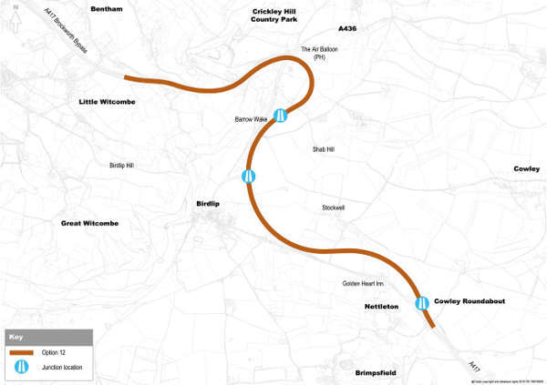 One option – Option 12 – is a four-mile surface route reusing sections of the existing A417 on Crickley Hill and Birdlip. New sections of road will be built at Nettleton and Emma's Grove. This option would include three new junctions – one at Cowley roundabout, one on the existing A417 close to the B4070 junction at Birdlip and one to the north of Barrow Wake. There would be three lanes of carriageway going up Crickley Hill and two lanes coming down.