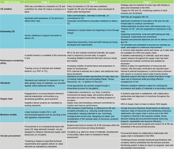 - Embedding CE: Some NRAs are adopting a more RE approach during highway maintenance and in designing maintenance regimes. Examples are a greater emphasis on achieving long service lifetimes, reducing waste and reducing embedded carbon.