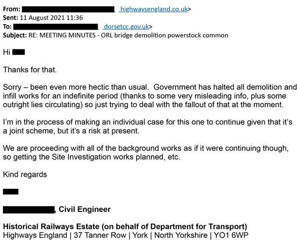 On 11 August, three weeks after ministers paused National Highways' works programme, the company's engineer told a Dorset Council official: ‘We are proceeding with all of the background works as if [the demolition] were continuing'.
