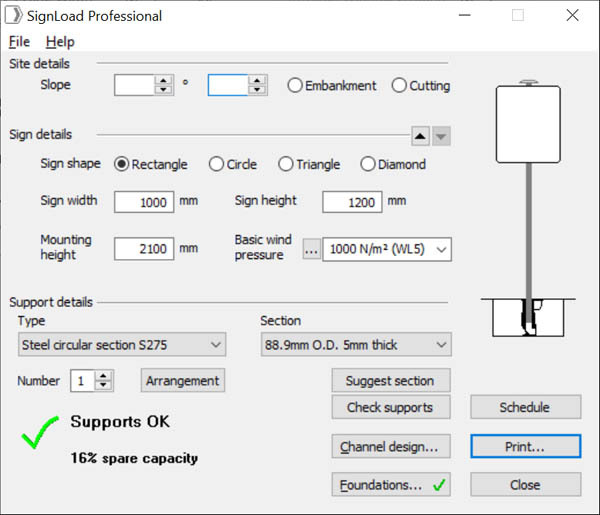 SignLoad Professional is a stand-alone design package for traffic signs to EN 12899, covering the design of the sign face, supports and foundations and includes checks for passive safety to EN 12767.