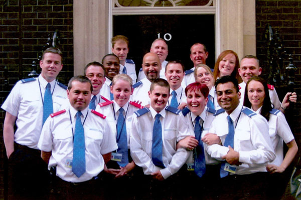 Frank Bird (second from left) and other traffic officers visit 10 Downing Street in 2004