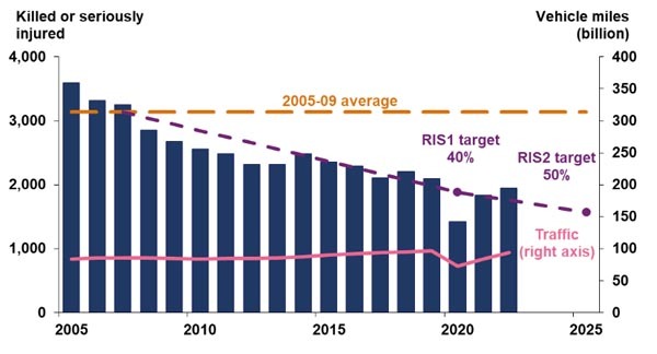 ‘In Road Period 2, ORR monitors National Highways' progress towards its ambition of zero harm through holding the company to account for its safety key performance indicator set by government of a 50% reduction in KSIs by the end of 2025, against a 2005-09 baseline.'