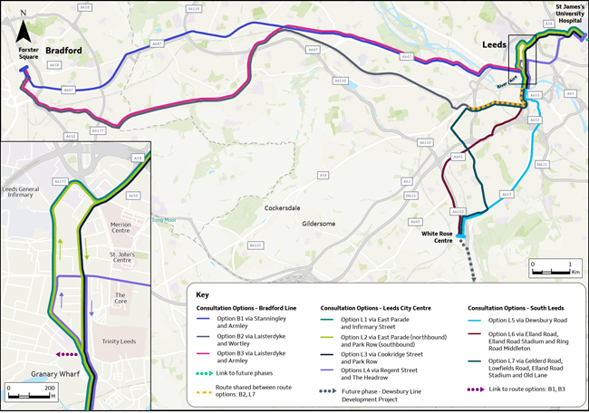 The proposal is for two lines – a Bradford Line and a Leeds Line, with the first having three possible routes and the second having multiple possible combinations of options.