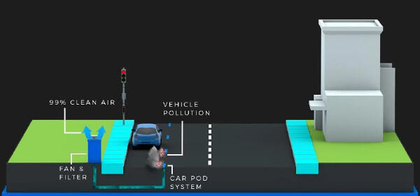 The technology involves a series of partially submerged pods installed in the centre of the carriageway where there is slow moving, and or stationary traffic, creating pollution hotspots. The pods are connected under the surface to pipework which extracts the polluted air into a roadside cleaning unit.