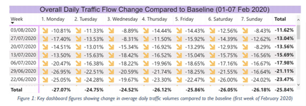 - Traffic for the week commencing 3 August saw an increase in flows (1.4 percentage points) compared to the previous week, bringing the overall traffic count average for the week to a reduction of 11.6% compared to the baseline (first week in February 2020).