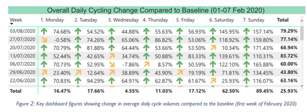 Cycling figures continue to show a steady increase and are now up to 79.29% higher than the February baseline figure.