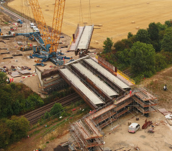 Picture shows a bridge beam lift over the Lincoln to Market Rasen railway line on the Lincoln Eastern Bypass - Galliford Try's biggest on-site project
