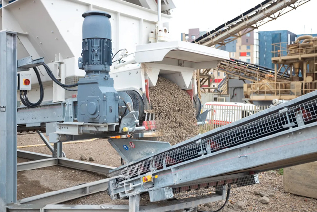 Concrete from demolished buildings is crushed and screened at an Aggregate Industries UK recycling site. It then undergoes a procedure in which CO2, captured from biogas plants, is liquified and injected into the concrete granules.