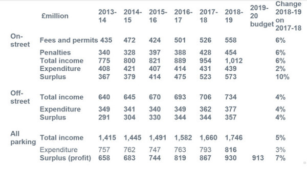 The RAC foundation said the 353 local authorities in England received total income of £1.746bn from their on and off-street parking operations in 2018-19 while spending £816m on running parking.