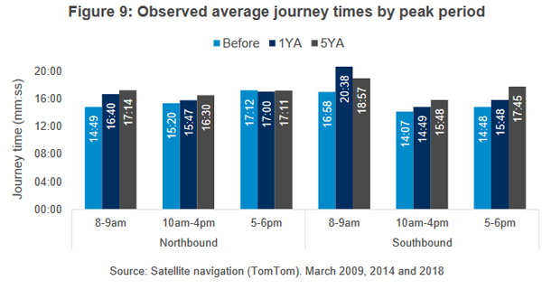 The report states: 'The evaluation observed little change in journey times for road users travelling northbound in the pm peak. For all other time periods, in both directions journey times have increased as shown in Figure 9.'