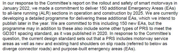 That document notes that what National Highways calls ‘emergency areas' are called an ‘emergency refuge area' in law and Mr Shapps noted that these have always been a sub-set of the wider concept of ‘refuge area', now known as a PRS.