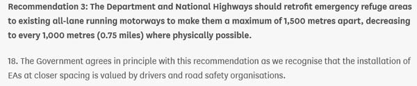 However, the committee's report last year specifically used the term emergency refuge areas, recommending that the Department for Transport (DfT) and National Highways should retrofit them to existing all-lane running motorways to make them a maximum of 1,500 metres (approximately a mile) apart, and every 1,000 metres (0.75 miles) where possible. In response, the DfT said it ‘agrees in principle with this recommendation'.