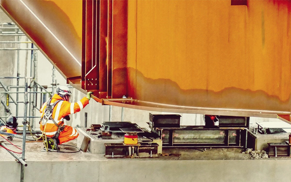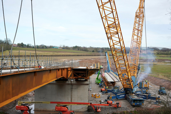 The spans are composed of steel girders, installed first from the east abutment, then from the west and tied together before a carefully-sequenced concrete pour, aligned to the optimum loading conditions for the steelwork, to create the bridge deck.