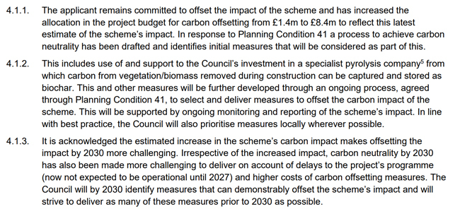 Including a (revised) estimate of 42,045 tCO2e from construction and other impacts, the scheme is now forecast to produce lifetime carbon emissions of 76,761 tCO2e, nearly three times the earlier forecast of 26,711 tCO2e.