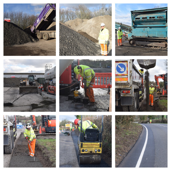 From top left, roadside planings and other materials excavated from the A285 site are taken back to the depot and stockpiled ready for recycling; heaped-up planings, awaiting the recycling process; the crushing and screening equipment used to form correct-sized aggregates for the hydraulically-bound material (HBM); the plant used for grading and mixing / manufacturing materials into HBM; quality-control testing cubes of HBM to check for required strength; the HBM is delivered to the A285; it's levelled and compacted; the binder course is applied and compacted; the finished product – showing the new roadside edge