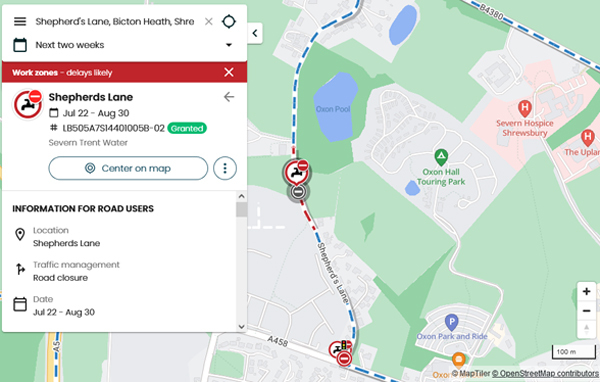 In fact, the highway authority's own interactive roadwork map shows a road closure at the site from 22 July to 30 August, whose status is ‘granted'.