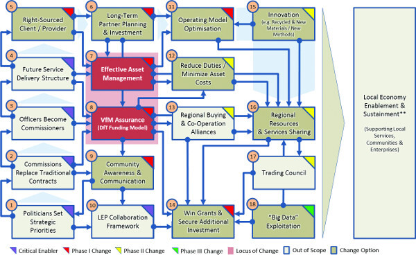 In February 2014, the FHRC – previously sponsored by Kier – brought together the representatives of 12 local highway authorities including Suffolk, to work with Proving Services Ltd operating from Cranfield University, to identify a step-change in how highway services could be delivered. Its participants looked beyond the HMEP tools for more radical solutions and, after 26 iterations, finally settled on a ‘route map' for future highways services. (See picture below)