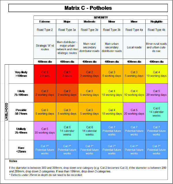 The risk-based approach that was adopted prioritised the scale of the defect against the extent to which it would be encountered. Intervention criteria were defined for all forms of highway infrastructure defect with seven different timescale categories, rather than using the ‘emergency', ‘category 1' and ‘category 2' distinctions in Well-maintained Highways.