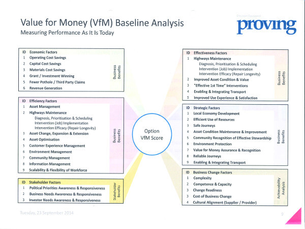 ‘In February 2016, we came across the Infrastructure Client Group's Alliancing Code of Practice and used it to sense-check what we were doing. While we had its themes of behaviour, integration and leadership reasonably well covered, more commercial work was needed. We red, amber and green-rated our progress against the code's four-by-four grid, but we needed a value for money (VfM) assessment, so I asked Proving Services to come to Suffolk and apply the assessment factor set to do that.' (see picture below)