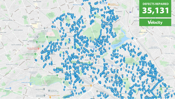 The firm said the council was able to carry out more than 50 repairs per day, compared to around 10-15 with a traditional gang. Over the two-year programme, 35,131 potholes and defects were repaired at an average cost of £24 each, which Velocity said compared to the typical cost to repair a pothole in London of £64.