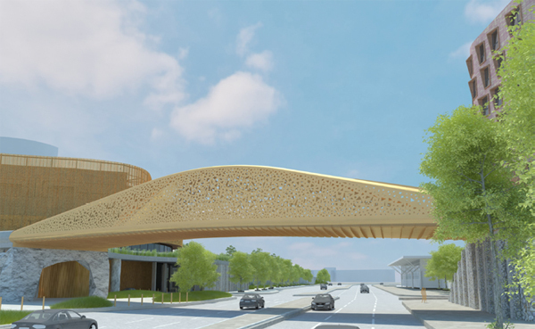 The design is a bow-string truss solution with the arches being shaped in plan, and the ‘string' being replaced with a minimal flat plate. The plate steel will be rolled into a bi-directionally curved surface to meet structural and architectural requirements.