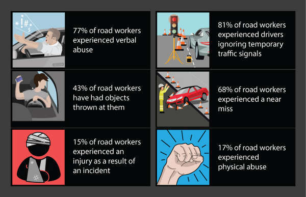 - Nearly one out of three road workers experienced missiles being thrown towards them in the past year by passing motorists. This included bottles of juice, coffee cups, eggs, foam bullets, food wrappers and banana skins – as well as reports of bottles of urine and even a dirty nappy.