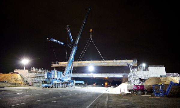 A specialist 50m-high crane will place the 44m-long steel beams that will help form two new bridges over the junction.