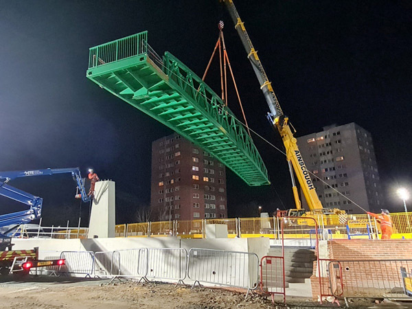 Two stair areas and seven ramp sections weighing up to 12 tonnes have been installed to the north of the A63, using a crane weighing 100 tonnes.