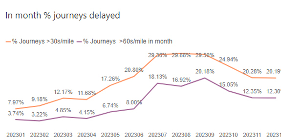 The data also shows that delays rose from an average of 6.4 seconds per mile in September 2022 to a peak of 31.8 seconds per mile a year later, before falling back to 24.6 seconds at the end of last year.