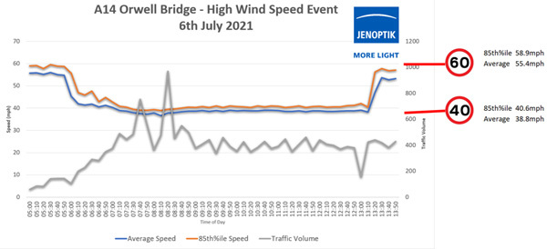 The stretch of the A14 usually has a 60mph limit, but this is lowered to 40mph in strong winds. Before the variable limit was in force, the bridge had to be closed completely in windy weather, but now that only happens when gusts over 60 mph are expected.