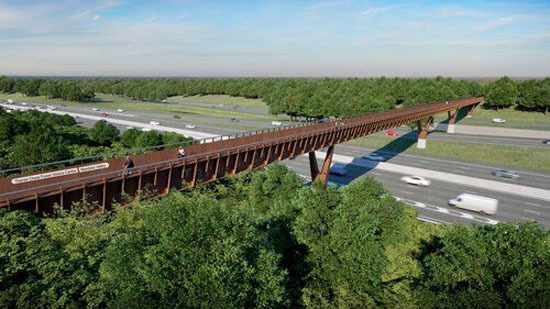 - seven new green bridges to provide ‘safe and easy' crossings for people and wildlife – including an 84 metre-wide bridge in Kent, ‘one of the widest green bridges in Europe'