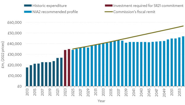 The progress review notes that the Government's stated plan beyond 2024-25 would freeze overall capital spending in cash terms and says that if this was applied to infrastructure spending, ‘it would not be consistent with the funding profile the Commission has set out to deliver the recommendations in the second Assessment'.
