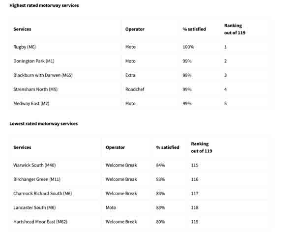 The transport user watchdog said that in the survey's fifth year, motorway service operators had again performed well overall, with 93% of visitors happy with their visit. All visitors were satisfied with their visit to Rugby services, the newest site on the motorway network.