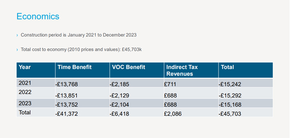However, the scheme's April 2020 Combined Modelling and Appraisal Report, obtained under freedom of information laws, calculated a cost to the economy of just £11m, based on the same assumptions and methodology.