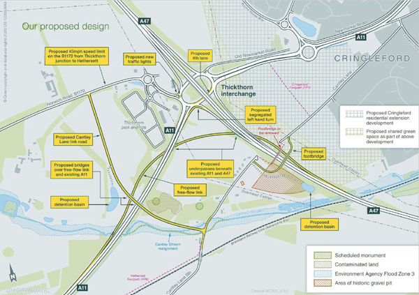 This will see two free-flowing connections between the A47 and the A11 as well as additional lanes and pedestrian crossings. A new half-mile link road will also be built and a new footbridge over the A47 will also be put in place around 45m to the east of the current bridge, which will be removed.