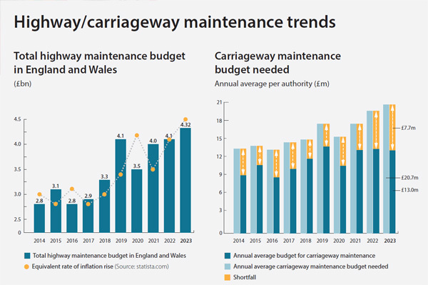 Average highway maintenance budgets across England and Wales increased by 4.5% to £25.8m per authority this year, but due to rising inflation this represents a cut in real terms. On top of this, the average percentage of highway maintenance budget allocated to the carriageway – rather than other assets such as signage, street lighting or drainage - dropped slightly to 50%, the lowest it has been for a decade.