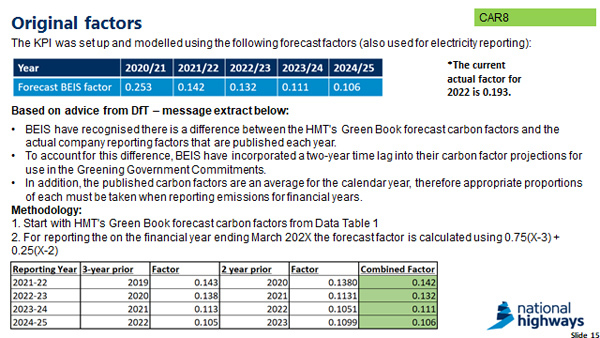 One slide of this document shows that, following advice from the DfT, National Highways obtained the carbon factor of 0.142 for 2021-22 by combining emissions forecasts from 2019 and 2020, reflecting concerns that the forecasts were not reflected in real-world emissions. This still left it at around three-quarters of the ‘actual' factor, which was 0.193.