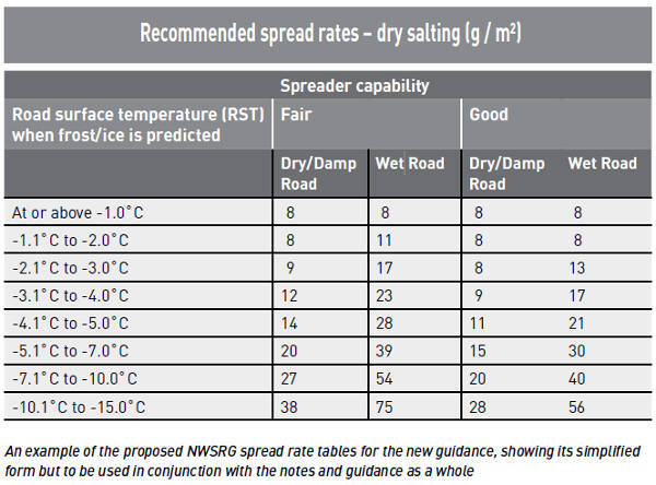 Finally, the guidance does not now explicitly refer to decision-makers having to consider salt losses when determining the appropriate salt spread rate to utilise, as these losses are now accounted for within the factors relating to traffic flow, thus reducing the remaining four columns to two. The simplification of the spread rate tables has enabled the NWSRG to address another issue.