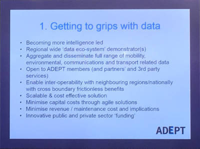 ‘ADEPT will ask them to work with highway authorities so they can integrate this work. Authorities should be able to buy a service from a regional data platform. We plan to approach three STBs later this year to carry out trials in this area.'